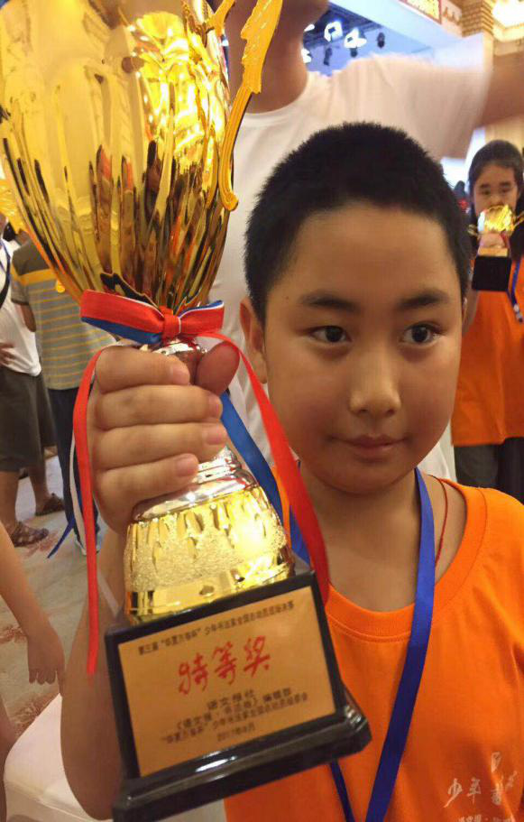 6岁时,初次参赛获得学校一等奖的这幅书法作品让他浅浅明白了字里行间的意思。