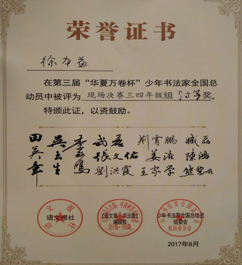 2017年、2019年,两次参加《语文报社》举办的华夏万卷杯现场书法比赛,他的参赛作品都获评特等奖。