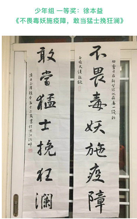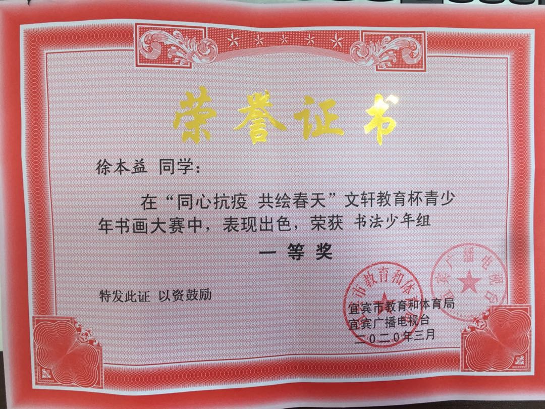 2020年参加“同心抗疫情,共绘春天”宜宾文轩教育杯青少年书画大赛,他再次获得一等奖。