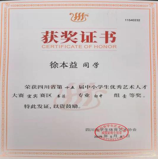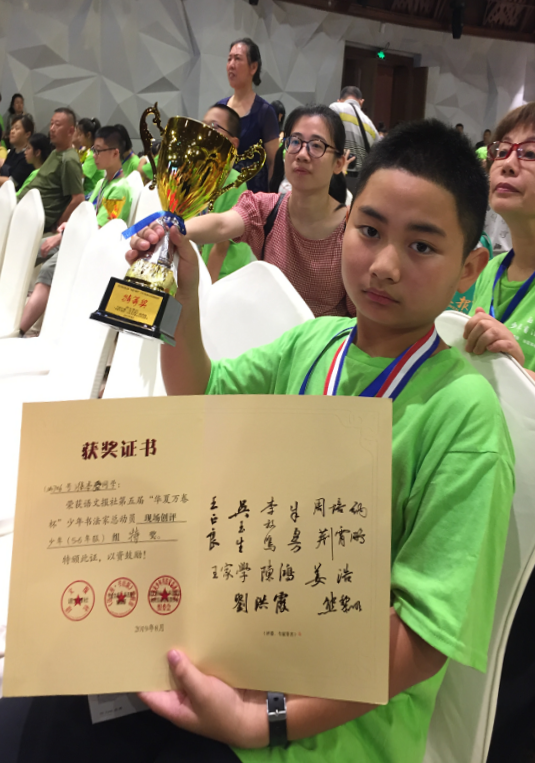 2019年参加宜宾市"中华诵"书法大赛,他赢得一等奖。